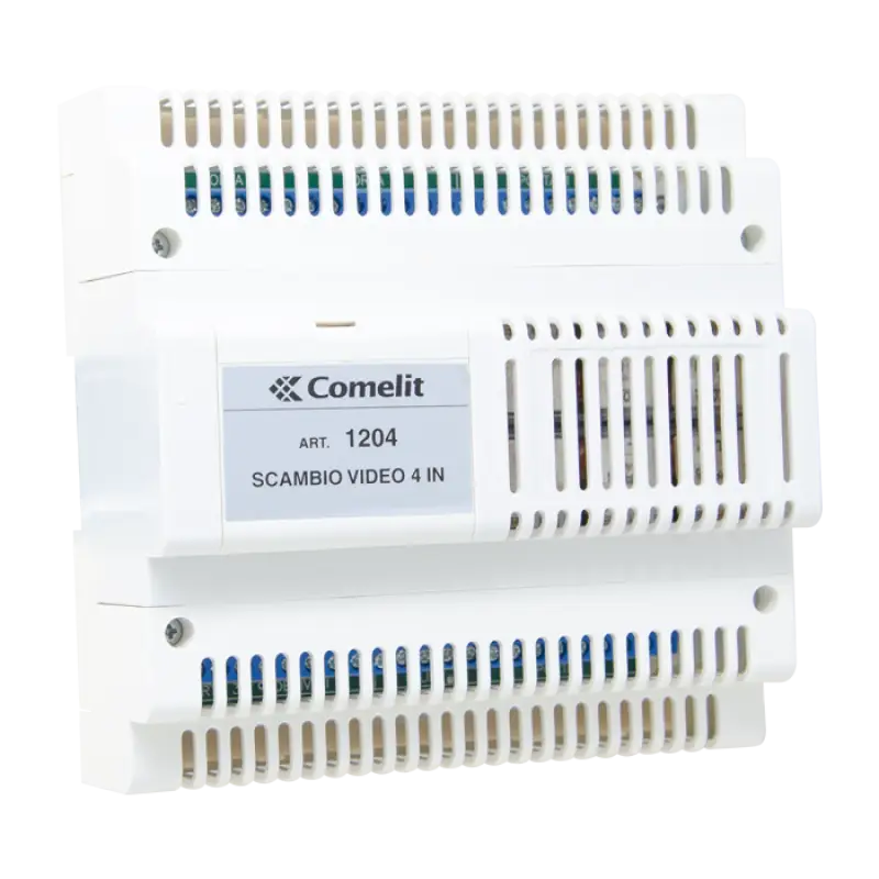 Scambio audio-video per impianti fino a 4 ingressi. Dimensioni: 140x140x67 mm (8 moduli DIN)